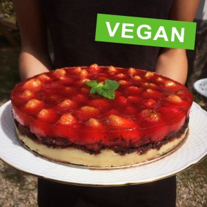 Strawberry Cake. Vegan with marzipan and chocolate.