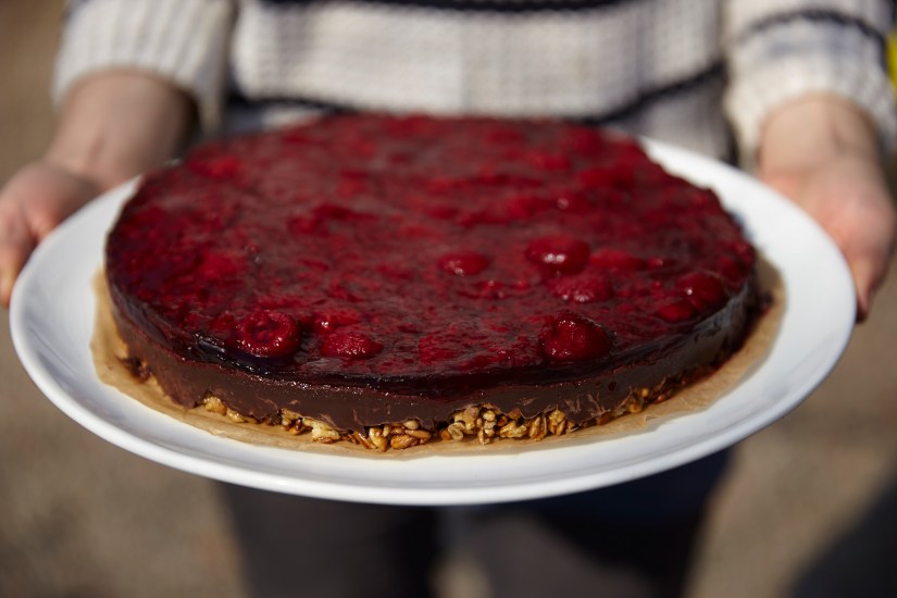 Nutcake with marzipan , chocolate and raspberries