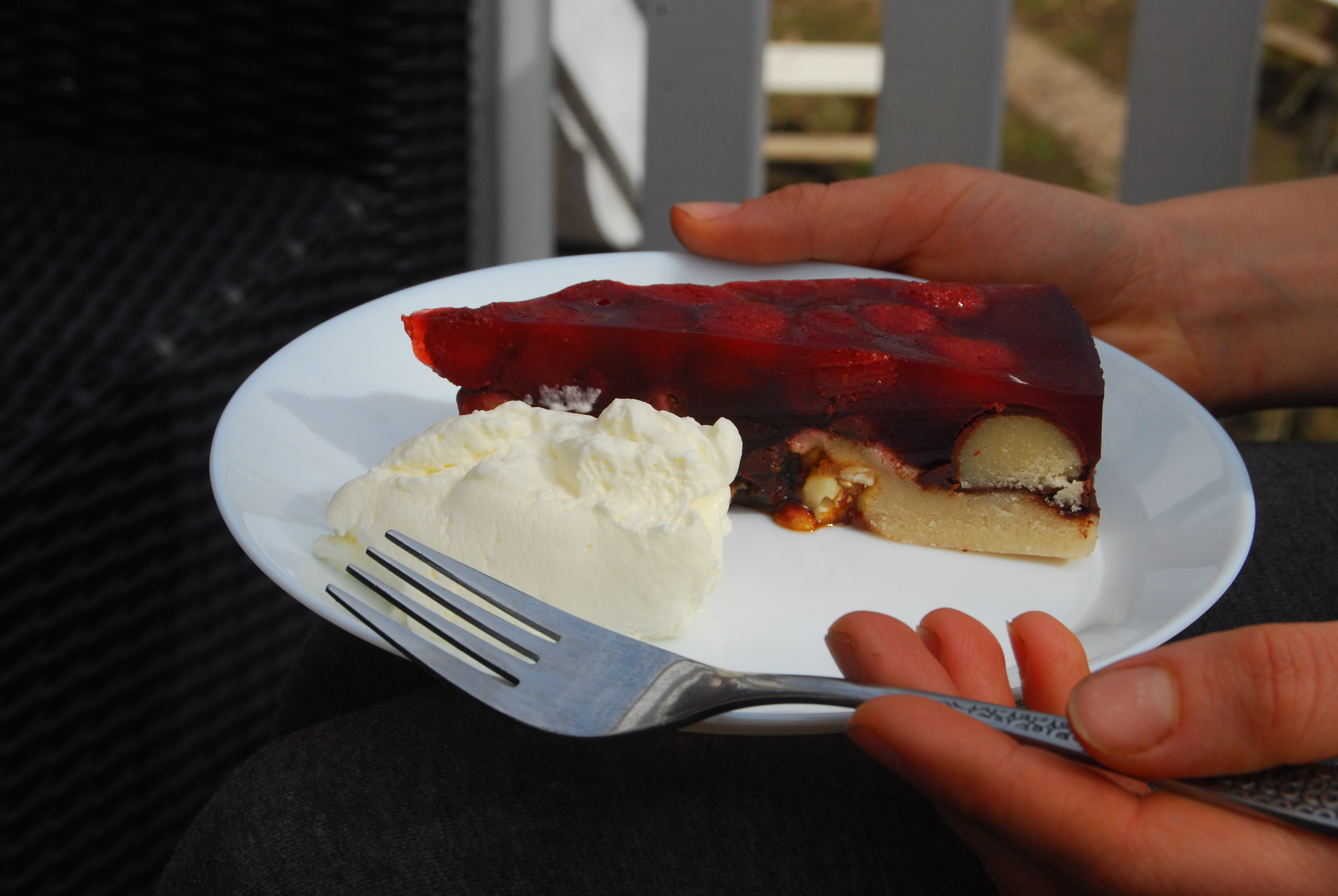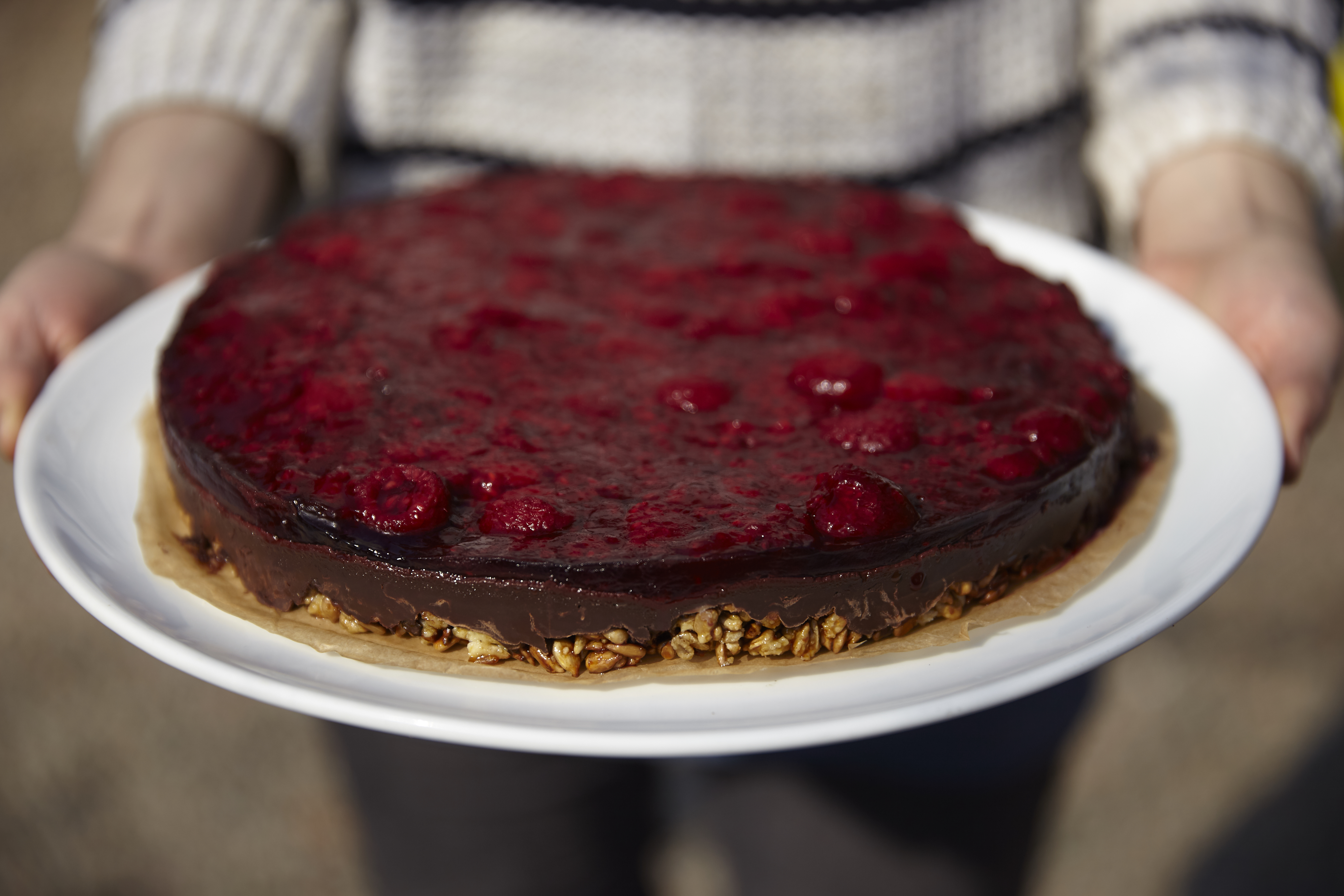 Nutcake with marzipan , chocolate and raspberries